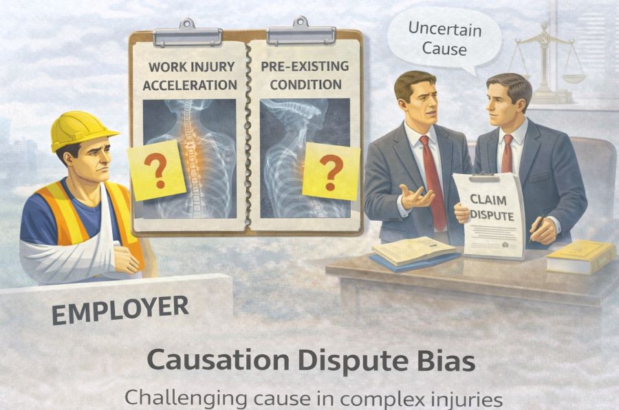 Causation dispute bias in insurance claims showing work injury versus pre-existing condition being challenged by insurers.