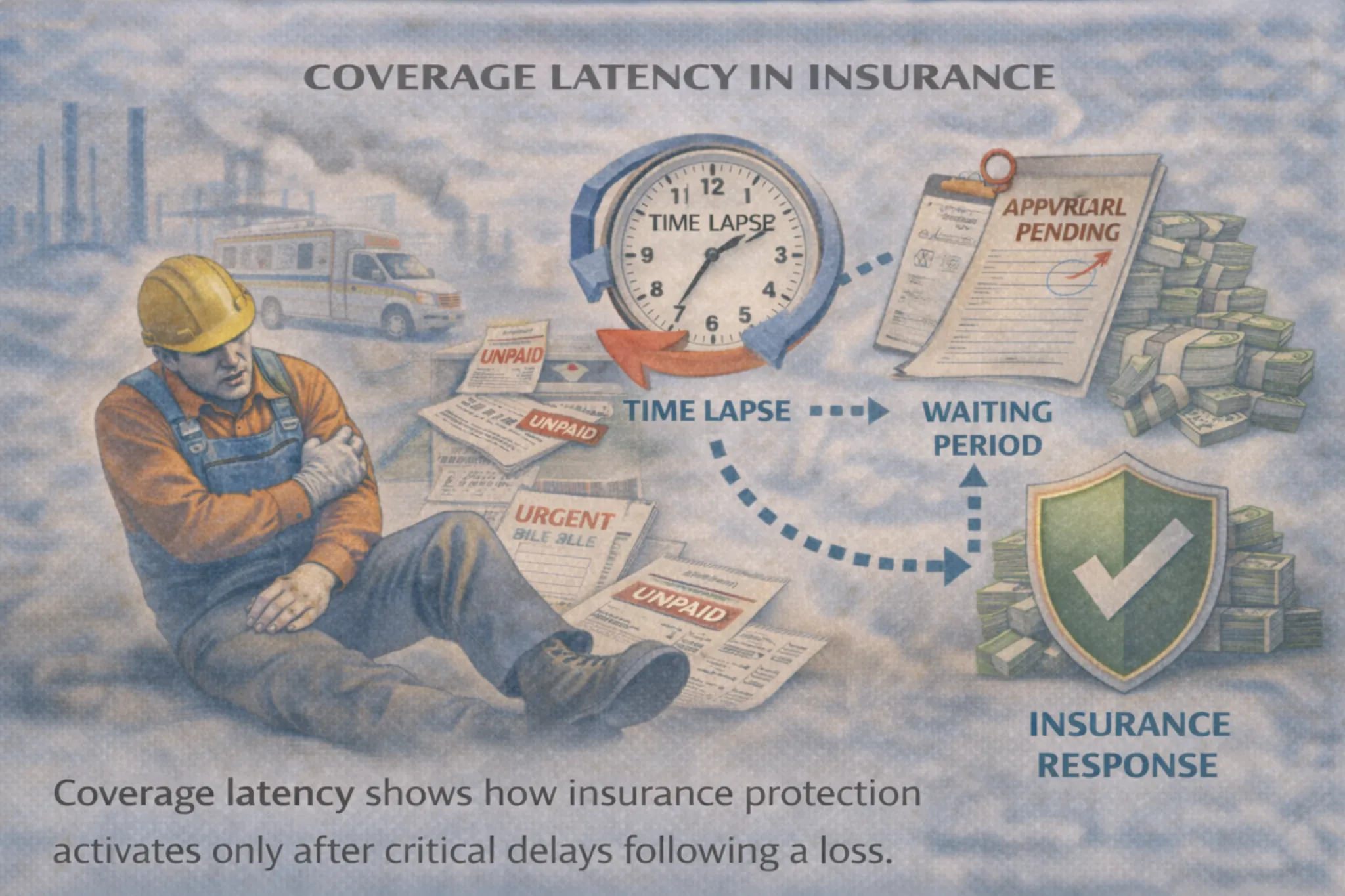 Coverage latency is the time gap between when a loss occurs and when insurance protection actually begins to respond.