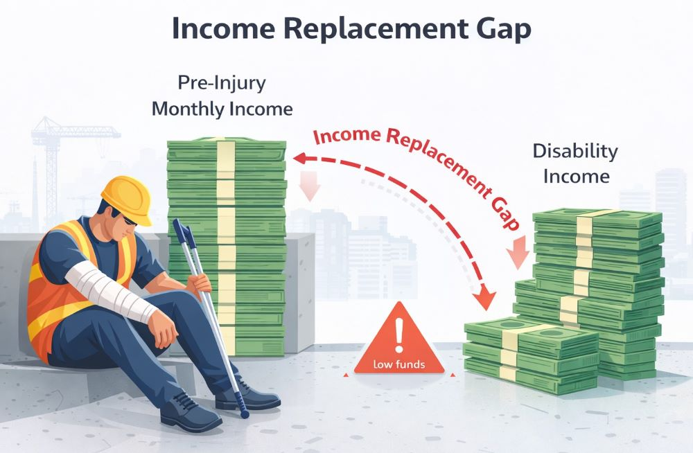 Income replacement gap refers to the shortfall between a high-risk worker’s pre-injury earnings and the actual income received during disability, after insurance benefit caps, offsets, exclusions, and duration limits are applied.